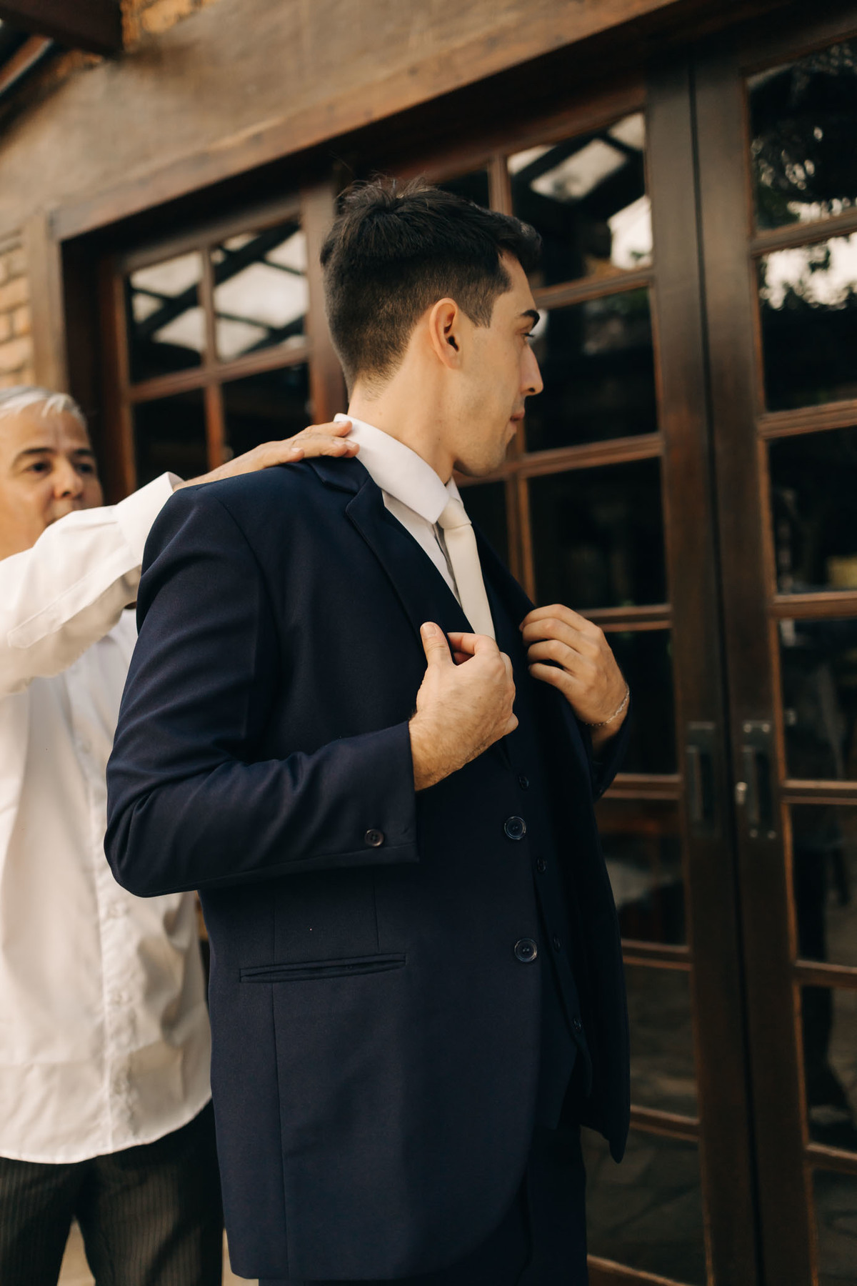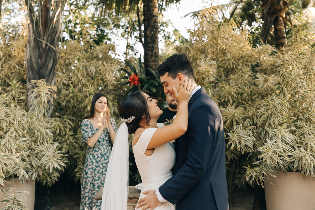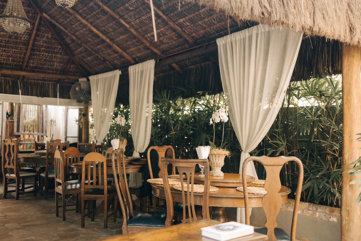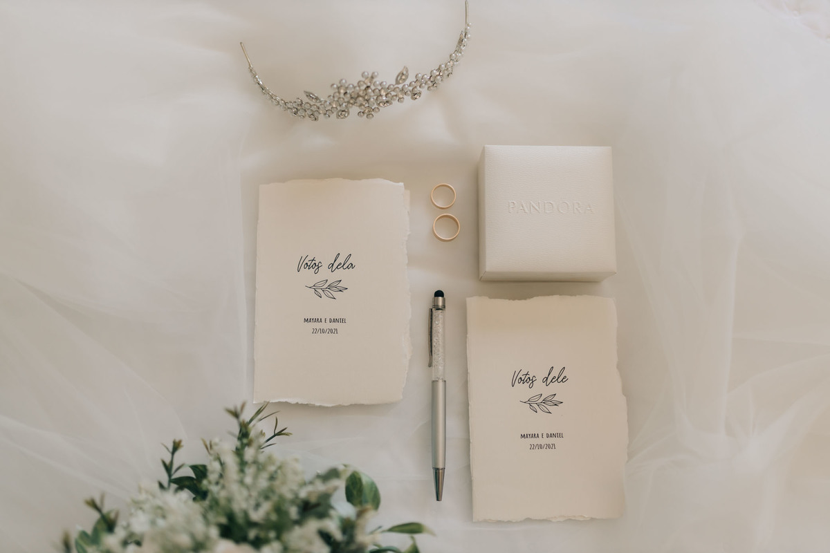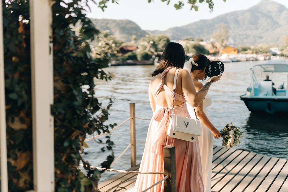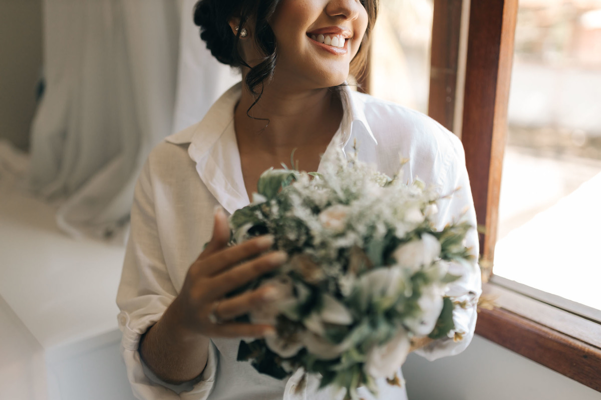 A Mayara me recebeu com os olhos emocionados e cheia de expectativa! Se arrumou em casa com a sua melhor amiga e colocou seu dedinho em cada detalhe da decoração. Ela e o Daniel escolheram se casar em um restaurante, localizado na Ilha da Gigóia;