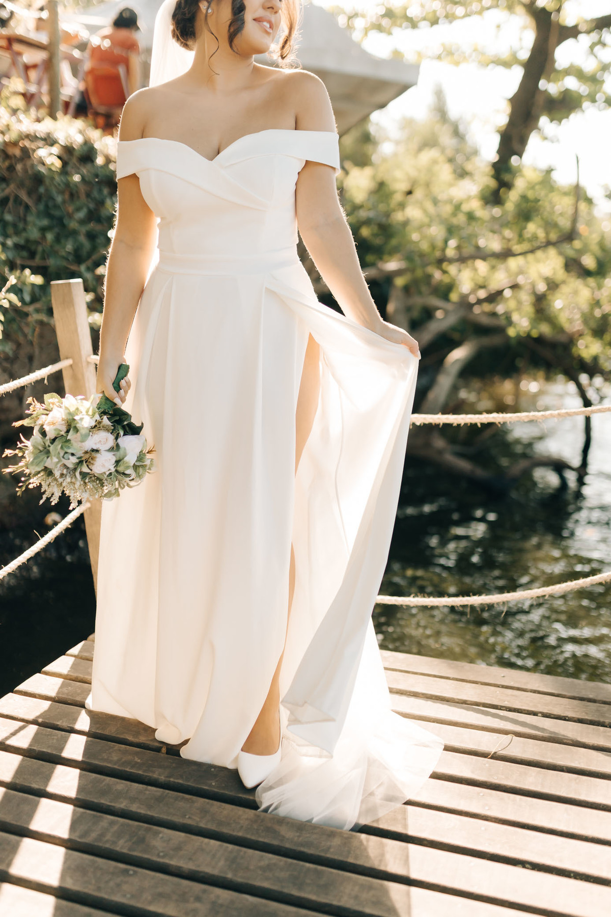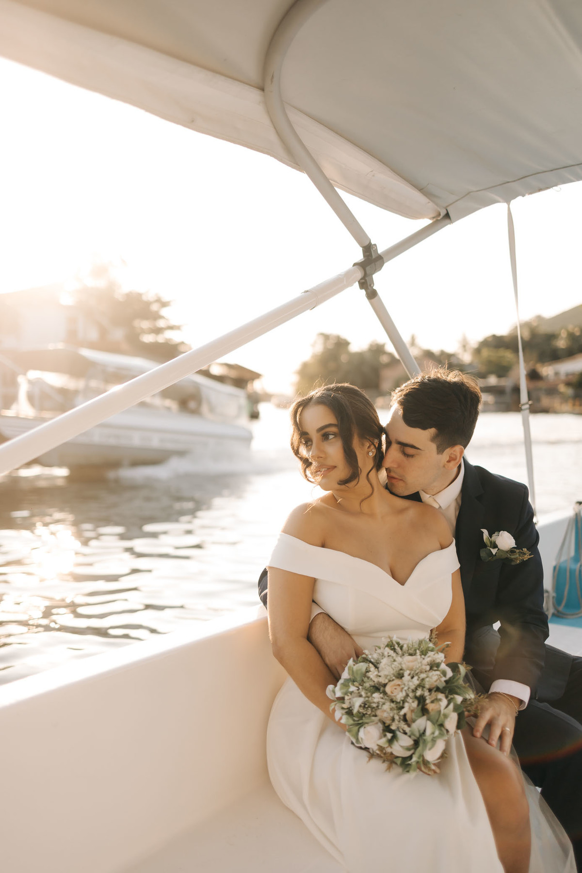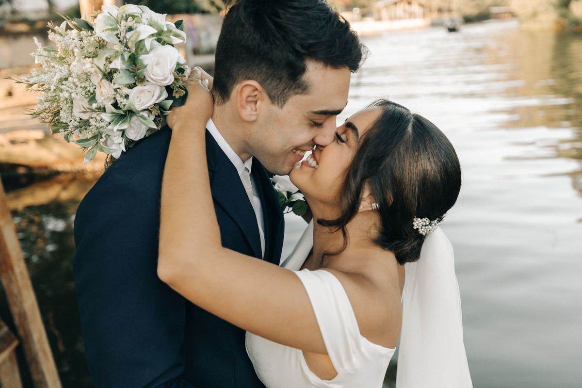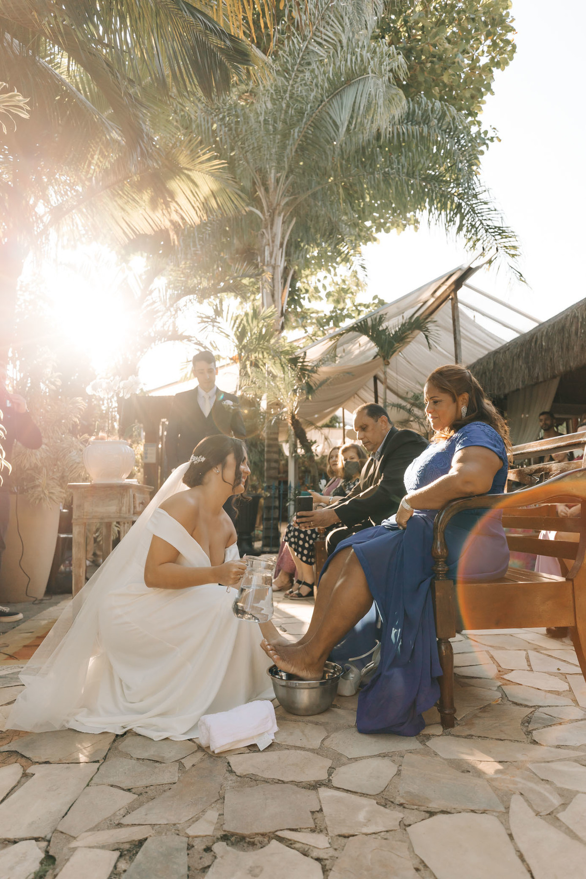 A Mayara me recebeu com os olhos emocionados e cheia de expectativa! Se arrumou em casa com a sua melhor amiga e colocou seu dedinho em cada detalhe da decoração. Ela e o Daniel escolheram se casar em um restaurante, localizado na Ilha da Gigóia;