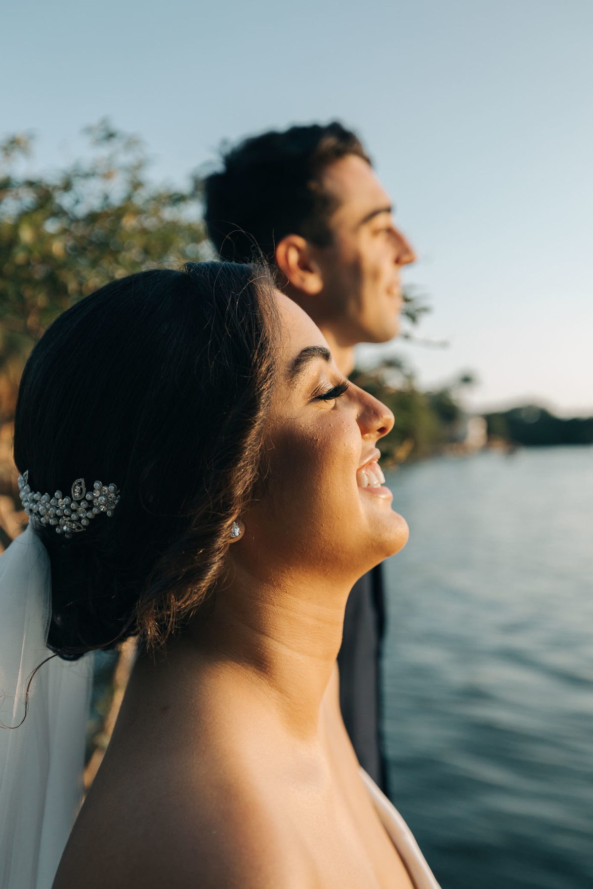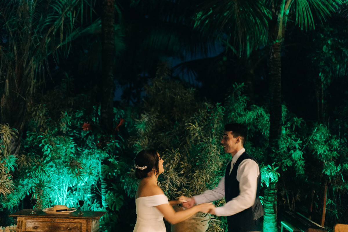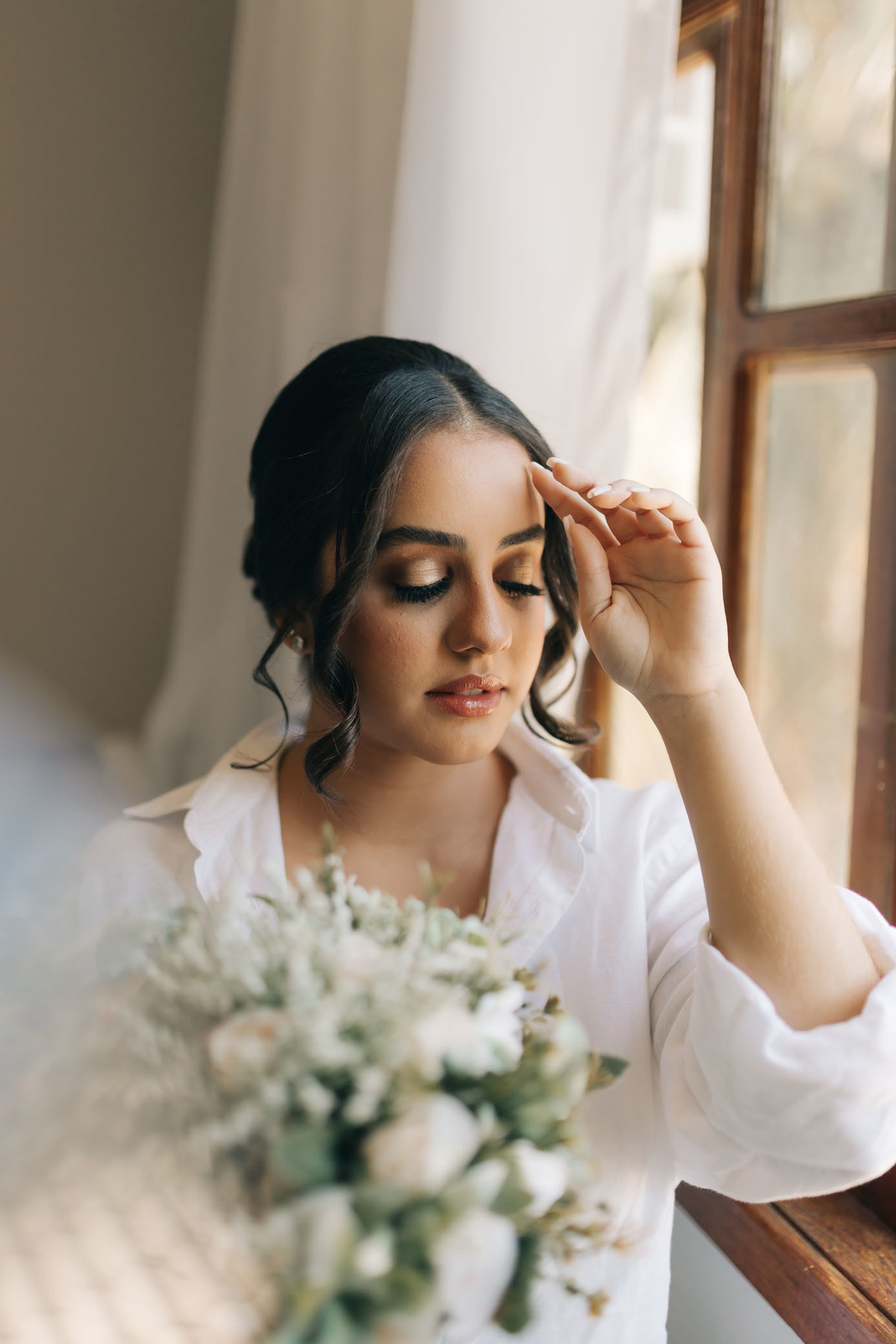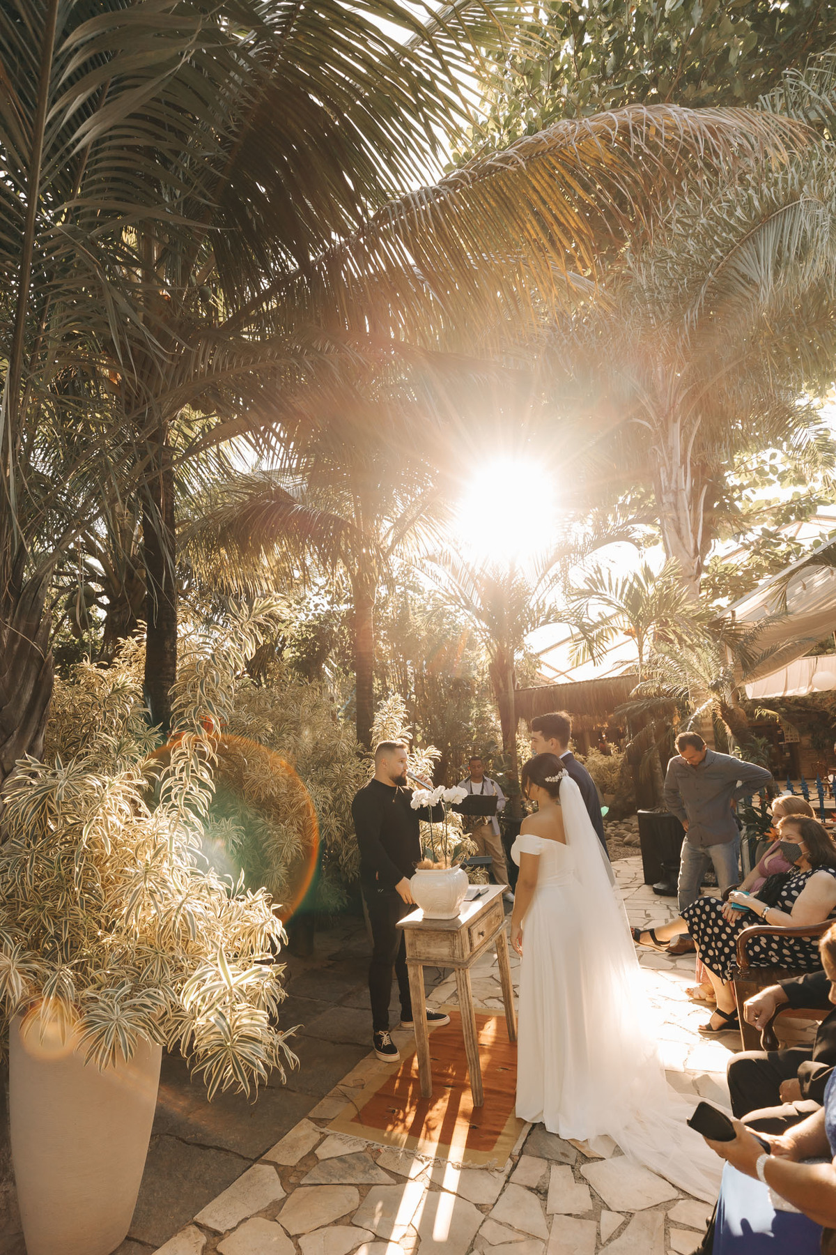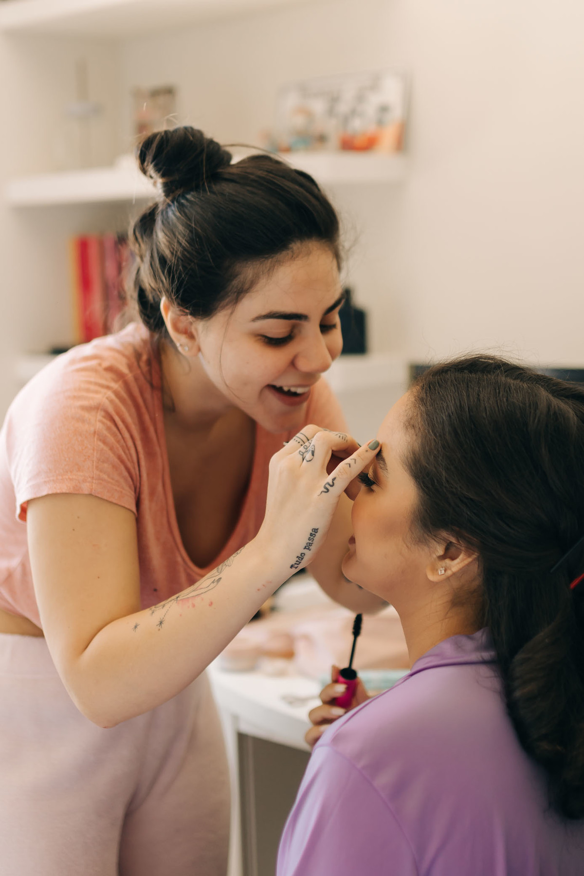 A Mayara me recebeu com os olhos emocionados e cheia de expectativa! Se arrumou em casa com a sua melhor amiga e colocou seu dedinho em cada detalhe da decoração. Ela e o Daniel escolheram se casar em um restaurante, localizado na Ilha da Gigóia;